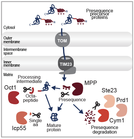 After crossing the mitochondrial membranes, the majority of mitochondrial precursors require proteolytic processing to become functional. The maturation step removes the mitochondrial targeting signal, the N-terminal presequence, which appr. 70% of all mitochondrial precursor proteins use to direct their import into the organelle. Using global N-proteomic approaches, we identified the substrate spectrum of the main Mitochondrial Processing Protease (MPP) and identified a secondary cleavage event required to stabilize the newly imported proteins. For this quality control, the Intermediate Cleaving Peptidase 55 (Icp55) or the OCTapeptidylaminopeptidase 1 (Oct1) removes a single amino acid or an additional octapeptide. The cleaved presequences and octapeptides are then degraded by the peptidases Cym1, Ste23 and Prd1. Together, these proteases form the presequence processing machinery and ensure proper protein maturation and hence proteome stability.