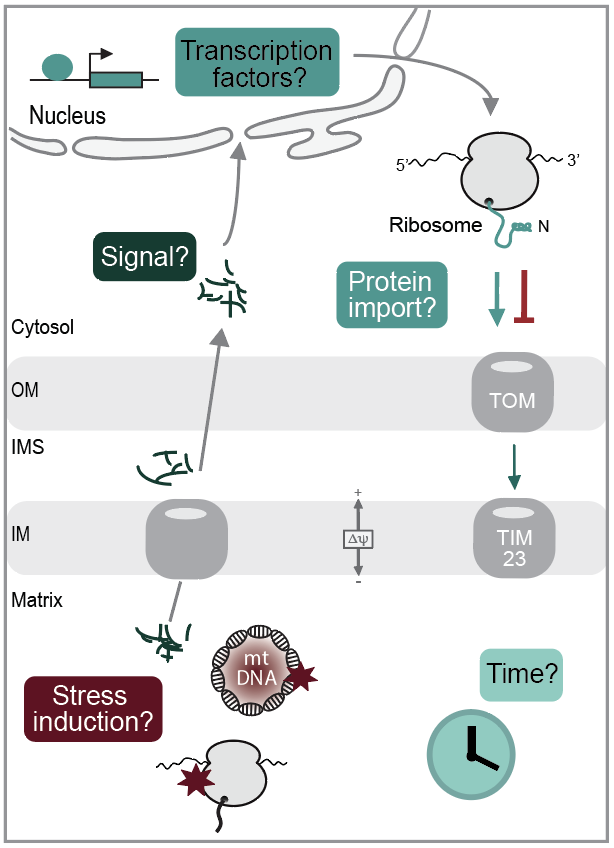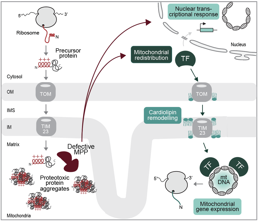 Mitochondrial proteostasis is critical for cellular health. During ageing, mitochondrial activity declines and dysfunction of has been linked to a variety of human diseases. Proteostasis is mainly maintained by a network of mitochondrial chaperones and proteases, that assist in protein folding and degrade non-functional or superfluous proteins. When mitochondrial quality control systems fail, the resulting proteomic imbalances are sensed by the cell and trigger protective cellular responses to restore and maintain organellar integrity. The best characterized are nuclear transcriptional changes that result in increased expression of chaperones and proteases to restore mitochondrial proteostasis. However, several aspects of the protective mitochondrial responses are incompletely understood: Which stress models reflect physiologically relevant mitochondrial defects? What is the signal that indicates mitochondrial dysfunction to the rest of the cell? Which transcription factors mediate the nuclear transcriptional response and how are newly synthesized chaperones and proteases imported into functionally compromised mitochondria?